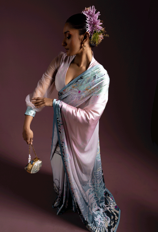 Personalized sarees for their special day. Shades of blue in whimsical print